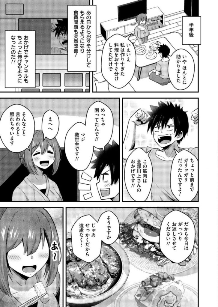 推しの筋トレ配信者にご飯を食べさせるお姉さんの話ほそぼそと自分の筋トレ動画を公開している主人公君。もともとお金がなくて食費、サプリが足らず、身体が大きくならなかったが、お隣のお姉さんがご飯をおすそ分けしてくれるようになり、そこからかなり栄養が取れるように!主人公はお姉さんに想いを寄せており、いつものお礼と称して部屋で一緒に食事をすることに成功したのだが…!