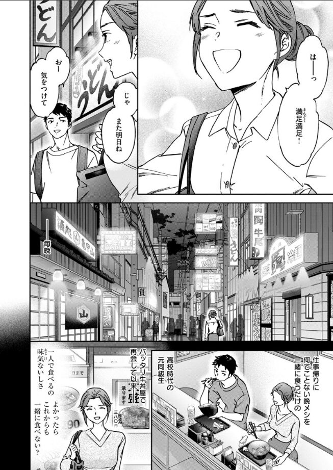 「今日、天丼のくちだったのに〜〜!」バッタリ再会して以来、仕事帰りに何てことない晩メシを一緒に食う仲になった、元同級生の俺たち。お目当ての天丼屋が閉まってたもんで、軽い気持ちで「俺が作ろうか?」って言ったら、俺の家でメシを食う展開に。そしたら彼女から「これからはお互いの家でごはん作り合いしない!?」との提案が。それって、もう付き合うみたいな……。「それも いいね」彼女が色っぽくそう答えたから……。