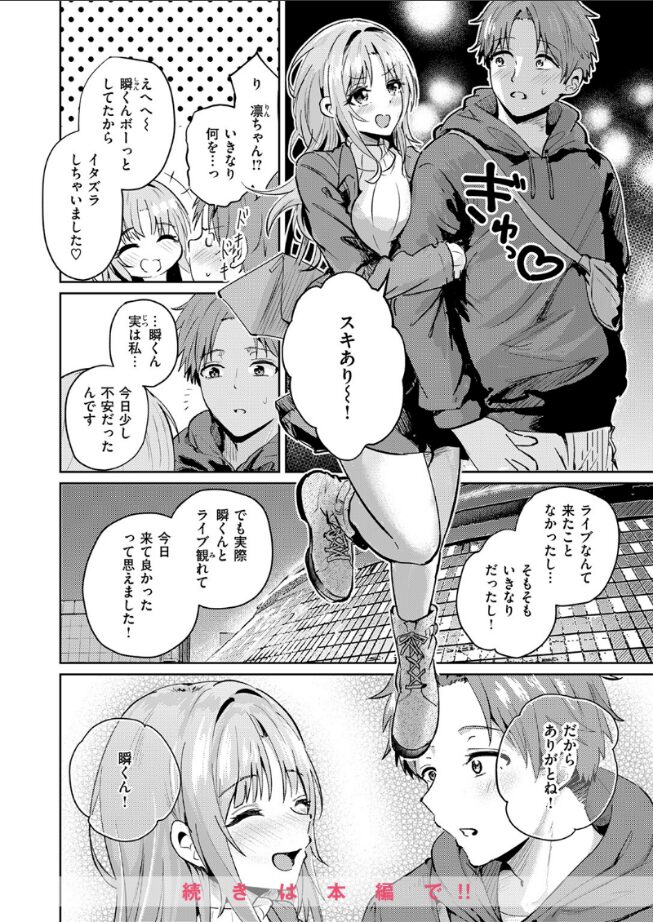「しちゃおーよ えっち」約束していたライブの待ち合わせをドタキャンしてきた友人・吉岡(よしおか)。代役を用意したと言い、凛(りん)と名乗るキラキラと可愛らしい女のコがやってきた。自分とやけに距離感が近く(なれなれしく)、それでいて真剣にライブに感動する様子がまぶしい謎の女のコ・凛ちゃんが気になりすぎてライブそっちのけ。流れでそのまま一緒にご飯を食べて、つい飲み過ぎて記憶が無くなってしまい……次に目が覚めたのは、なぜか自分の部屋だった。そして意外な凛ちゃんの正体も明らかになり……!!