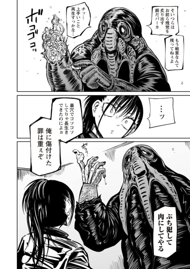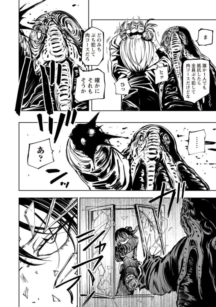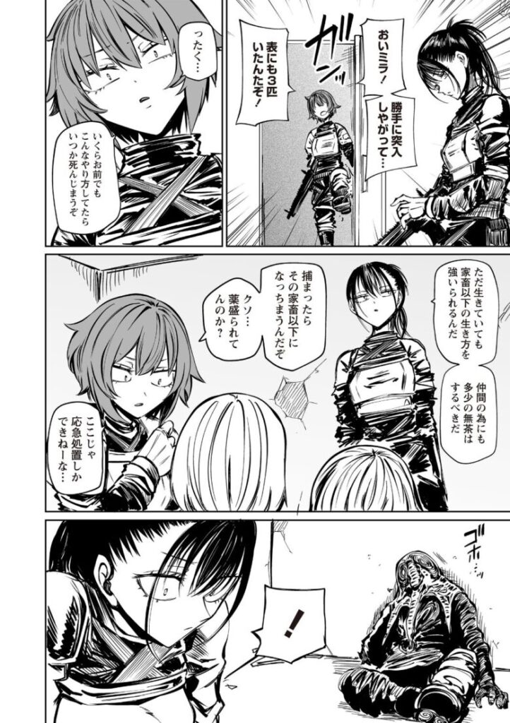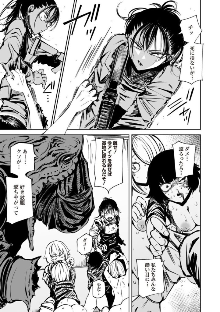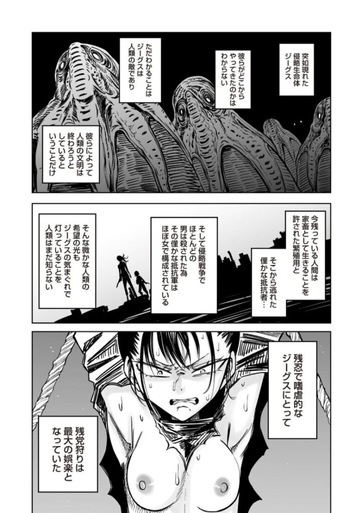 侵略者の手に堕ちた人類。捕らわれた女兵士は、仲間の眼前で凌●の限りを尽くされる!死に臨む彼女が最期に選んだ行動は――!?