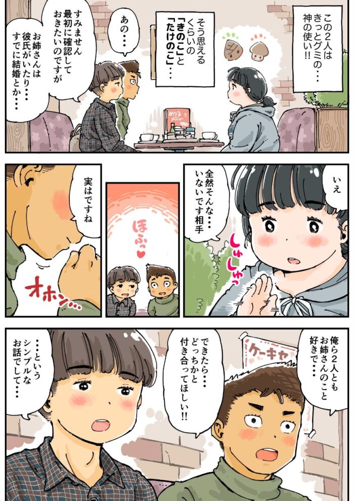大好きなグミ「きのたけグミ」を長年食べ続けたぽっちゃり女子(36)に奇跡が起こり、「きのこっぽい男子」と「たけのこっぽい男子」に同時告白されてしまう!!選ぶなんてできない…けど話の流れでとりあえず先に体の相性だけ確認してみることに。3人でラブホテルに行きまして…いろいろあって…しまいには猫耳で中出しで子宮ぱんぱんで幸せいっぱいになってしまう!果たしてぽっちゃり女子はどっちの男子と付き合うのでしょうか…フルカラー<表紙など4P+本編46P>