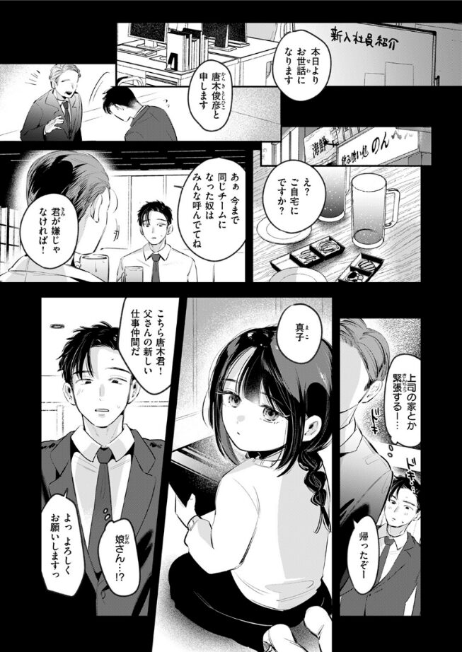 「《これ》してる間って私だけを見ててくれるんだ」地震の影響で電車が止まり、上司の家に招かれた唐木(からき)。そこには上司に頼まれ、昔から面倒を見ている上司の娘・真子(まこ)がいた。上司が離婚した妻の元へ行くと家を出て行った後、「私が何も知らないと思ってるんだろうね」とコンドームを差し出しながら真子が迫ってきて――