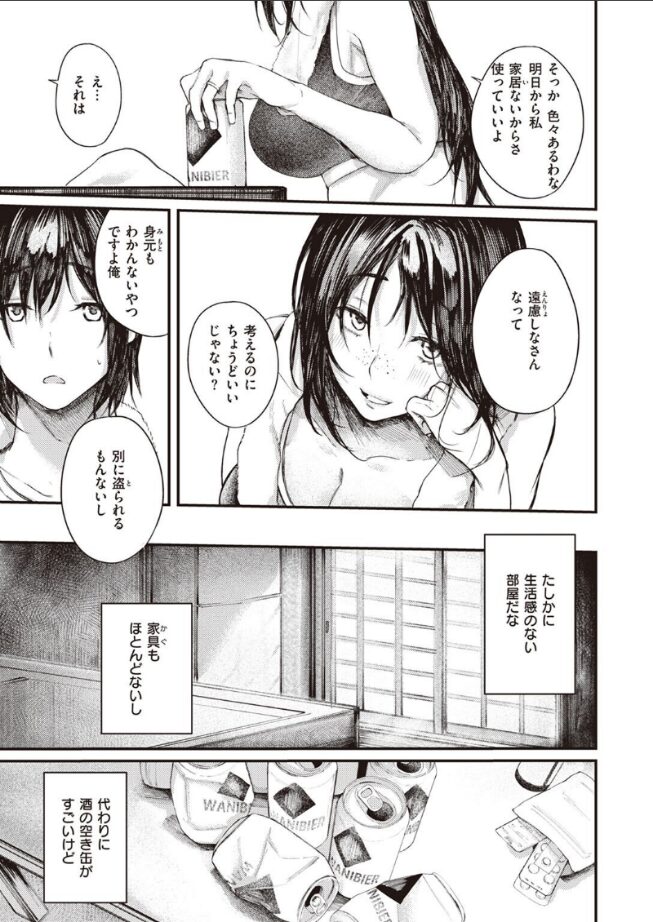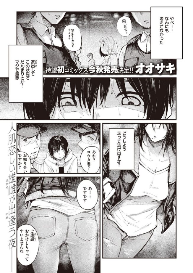 人肌恋しいふたりの雄雌が、出会う夜――。とある繁華街、行く当てもなく家を飛び出した男子を拾ったのは……色白美人なお姉さん!!寝ている隙に脱童貞!? しかもお姉さんは、まさかの人妻で……!?ミステリアスなお姉さんと過ごすアツ〜い一夜。思わず触れたくなるような、豊満な胸をご堪能ください。