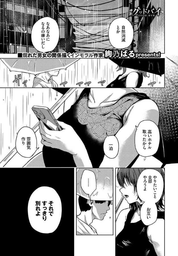 【終わりゆく男女が滾る肉欲ぶつけ合う激情セックス!】至高のダークファッカー・絢乃ばるが綴る、胸締めつけるラストSEX!!長くつきあっていた彼女と別れることになった主人公。そしてホテルで最後の一夜を過ごすことになり、思いのままSEXをする。その最中今までの後悔が頭をよぎる主人公だが、一方の彼女は…!? 本能のままに求め合い火花散らす濃密ラブホプレイ!!