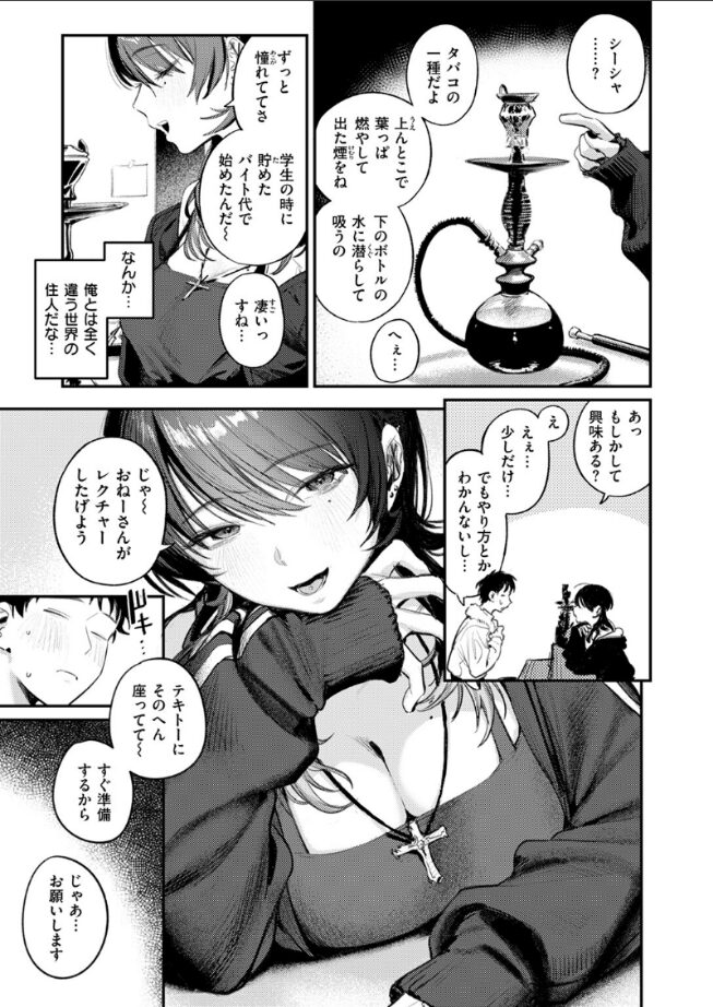 「スモーキングキス…頭ぼ〜っとして気持ちーでしょ」就活に卒論……何も上手く行かない日々。面接の帰り道、大雨の中で項垂れていると、ピアスバチバチのサブカル系お姉さん・カナに声をかけられ、彼女が経営しているというシーシャバーで雨宿りをすることに。店内に招かれ、初めてのシーシャ体験に癒された俺は、定期的に店に通うようになる。ある日、店で客に絡まれているカナさんを助けると、この後時間があるかどうか聞かれ……。そして閉店後、2人きりの店内。フレーバーの味見をしてほしいとキスをされ、そのままピアスのついた舌でフェラしてくれて……。