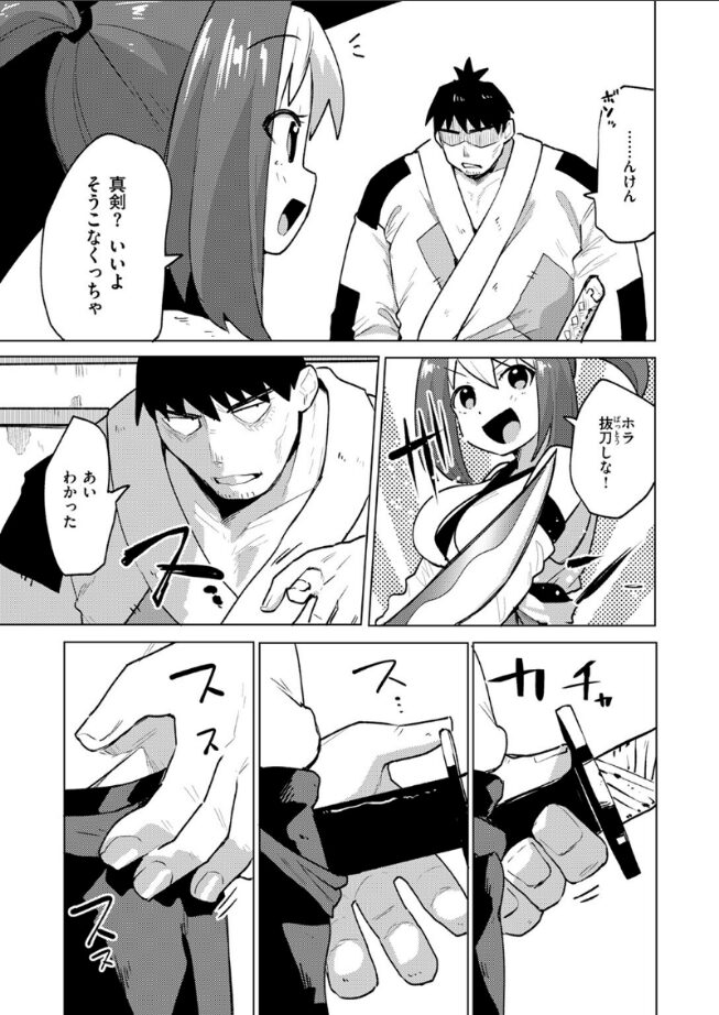 「言っただろう《チン剣勝負》だと」町外れの道場を治める女剣豪・おリョウは真剣勝負で無敗を誇っていた。「私に勝ったらなんでもしてやる」と豪語する彼女の前に現れたのは無骨な巨漢・熊兵衛(くまべえ)。デカいだけと侮るおリョウだったが、熊兵衛が抜刀したのは真剣ではなく《チン剣》だった!!チン剣が無いおリョウは負けを認め、そのまま男の言いなりで快楽地獄へ堕とされていく……。