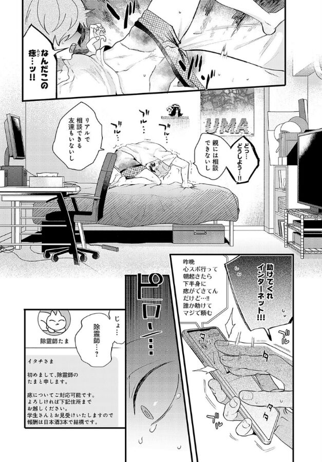 主人公・鼬川は、心霊スポットを探索した翌日に身体が痣だらけになってしまった! 狼狽する鼬川は、除霊師を名乗る巨乳ショートカット美女・たまに頼るのだが…。童貞の身体を依り処にする厄介な霊が憑いていると診断された鼬川は「ホンモノ見せて満足さすんが一番手っ取り早いんよ」というたまの助言に従い、たまとSEXをすることに!? たまの丁寧なフェラで皮を剥かれた童貞チ○ポを彼女のマ○コに挿入しなければ鼬川の平穏は戻らないッ!!次世代肉感エロ作家・GURIDA先生が贈る、怪しいお姉さんに搾り取られる俺の童貞♪