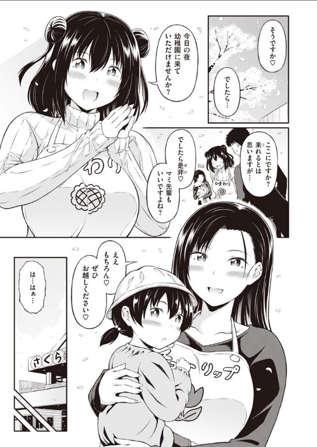 「今日は普段の『お疲れ』を…いっぱい癒してくださいね」保育士の前で、つい弱音をはいてしまった近藤(こんどう)。そんな近藤の≪疲れ≫に、ハナとマミがした提案とは……!?3P! パイズリ! ぶっかけ! 中出し! 優しい保育士たちと夢のような桃色展開……!!